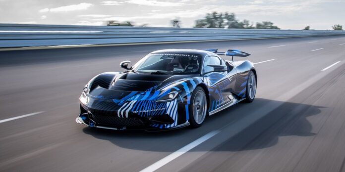 El hiper auto eléctrico, con sus 1873 caballos de fuerza y 1696 libras-pie de torque, superó su primera ronda de vueltas de alta velocidad en el circuito peraltado de 7.8 millas de largo en la pista de pruebas de Nardò en el sureste de Italia.