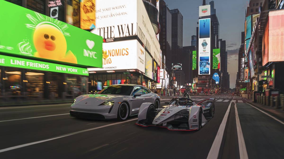 Antes de que el equipo TAG Heuer Porsche de Fórmula E debute en Nueva York, dos Porsche totalmente eléctricos, un 99X Electric y un Taycan 4S, captaron la atención en una espectacular sesión de fotos en la mundialmente famosa Times Square.