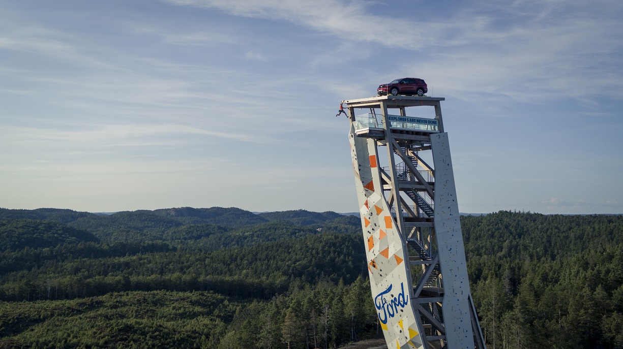 Para el audaz desafío Explore New Heights, diseñado para celebrar el espíritu de aventura y determinación que impulsa a los clientes de estilo de vida activo de Ford, la compañía creó una plataforma especial para respaldar el Explorer Plug-In Hibrido en la parte superior del voladizo espeluznante de la torre.