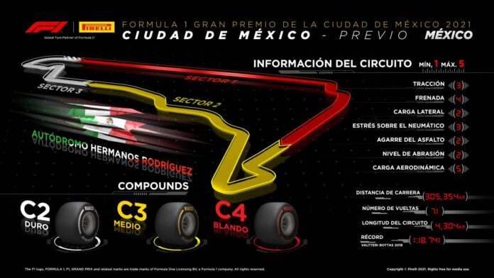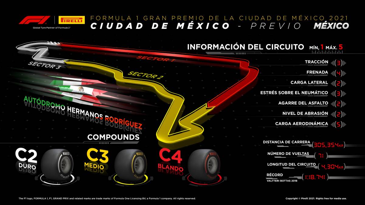 Como ya ocurrió en Estados Unidos, el GP de México regresa al calendario tras dos años de ausencia. Esta cita se afrontará también con los compuestos de la zona media: C2 como P Zero Blanco (duro), C3 como P Zero Amarillo (medio) y C4 como P Zero Rojo (blando).