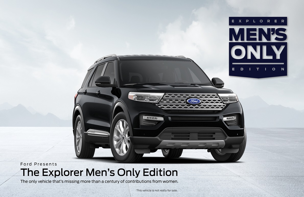 El video irónico “Ford Explorer Men’s Only Edition” inicialmente parece ser un anuncio de automóvil tradicional que muestra un nuevo Ford Explorer. El narrador Bryan Cranston luego explica que la “Ford Explorer Men’s Only Edition” es un vehículo completamente rediseñado sin muchas de las características esenciales desarrolladas por mujeres, incluidos calentadores, limpiaparabrisas, señales de giro, luces de freno y GPS.